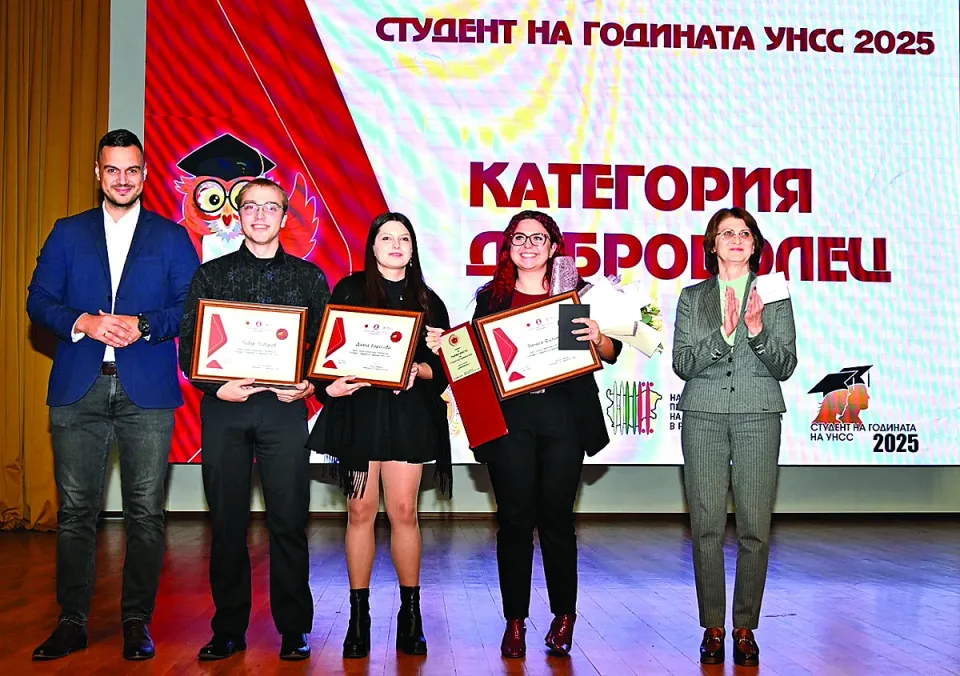 Като част от сътрудничеството между Студентския съвет на УНСС и Евроинс, председателят на Съвета на директорите на компанията - Йоанна Цонева, беше официален гост на церемонията Студент на годината на УНСС 2025 г., проведена на 25 ноември в аула „Максима“, УНСС.За 13та поред година Студентският съвет на УНСС отличиха най-изявените студенти на университета в няколко категории . Госпожа Цонева връчи наградата на победителя в категория “Доброволец” на Ванеса Филипова, бакалавър от специалност “Право”. Ванеса получи наградата за доброволческата си дейност и активното си участие в борбата за пътна безопасност.