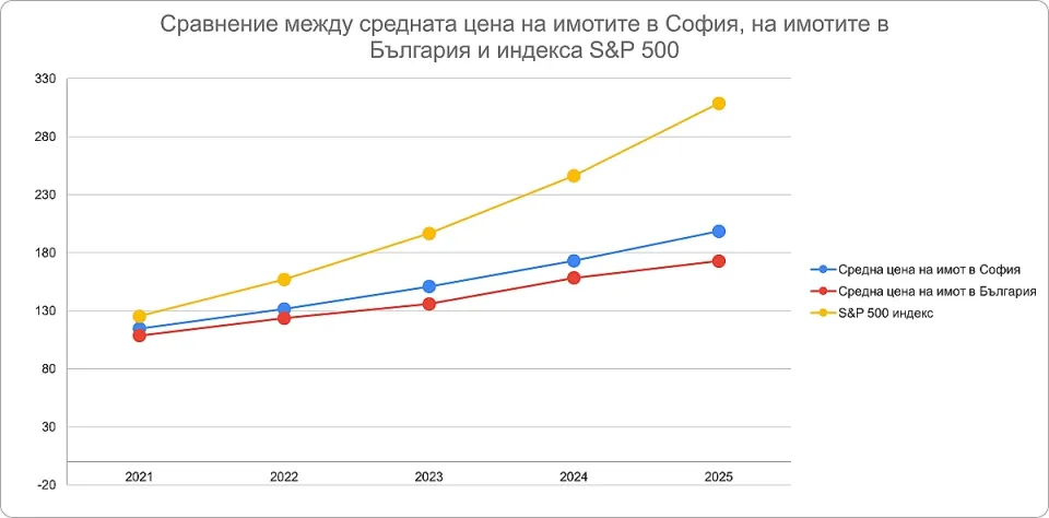 За разлика от местния пазар на имоти, глобалните капиталови пазари отбелязват значителна доходност. MSCI World Index нараства със 170%, а S&P 500 – с над 200% за последните пет години. Това означава, че инвеститор, вложил 100 000 евро в началото на 2020 г., днес би разполагал със 175 000 евро при имотна инвестиция, но със 270 000 евро при MSCI World и 308 000 евро при S&P 500.