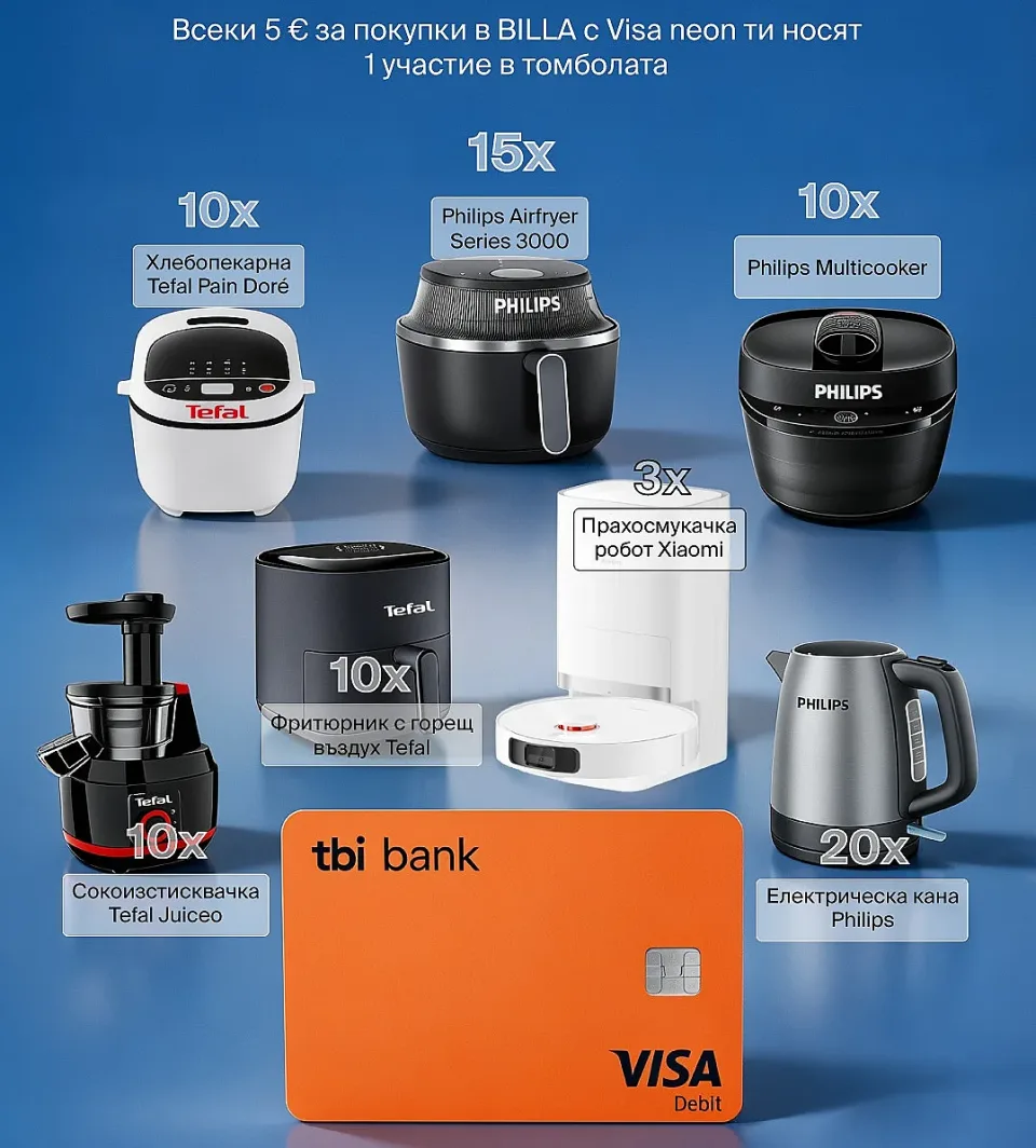 Новите клиенти, които активират своята карта Visa neon в супер приложението на tbi bank и направят покупка в BILLA на стойност поне 25 евро, ще получат еднократен кешбек от 10 евро директно в разплащателната сметка към картата. В същото време всички притежатели на Visa neon – нови и досегашни, които пазаруват в магазините на BILLA по време на кампанията, автоматично участват в седмични томболи за разнообразни домакински уреди, включително прахосмукачки-роботи, уреди за здравословно готвене (air fryer, multicooker), хлебопекарни и много други.