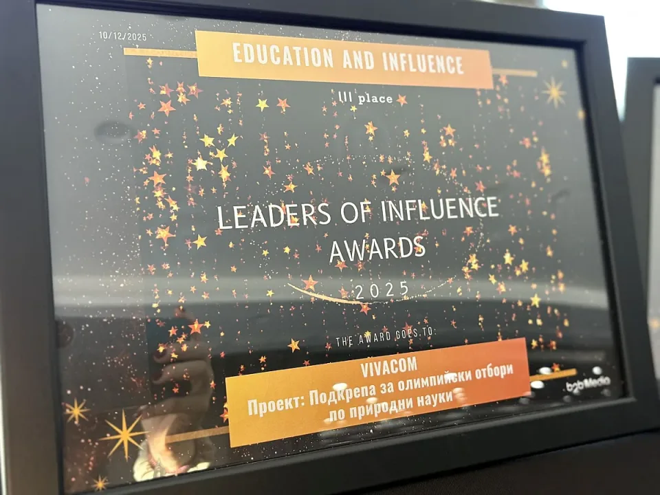 На специална церемония Vivacom получи две отличия в престижния конкурс Leaders of Influence Awards 2025, организиран от b2b Media. Телекомът спечели първо място в категорията „Лидер в ESG“ и трето място в категорията „Образование и въздействие“, като журито отчете дългосрочния ангажимент на компанията към устойчивото развитие, инвестициите в млади таланти и създаването на значима обществена стойност.