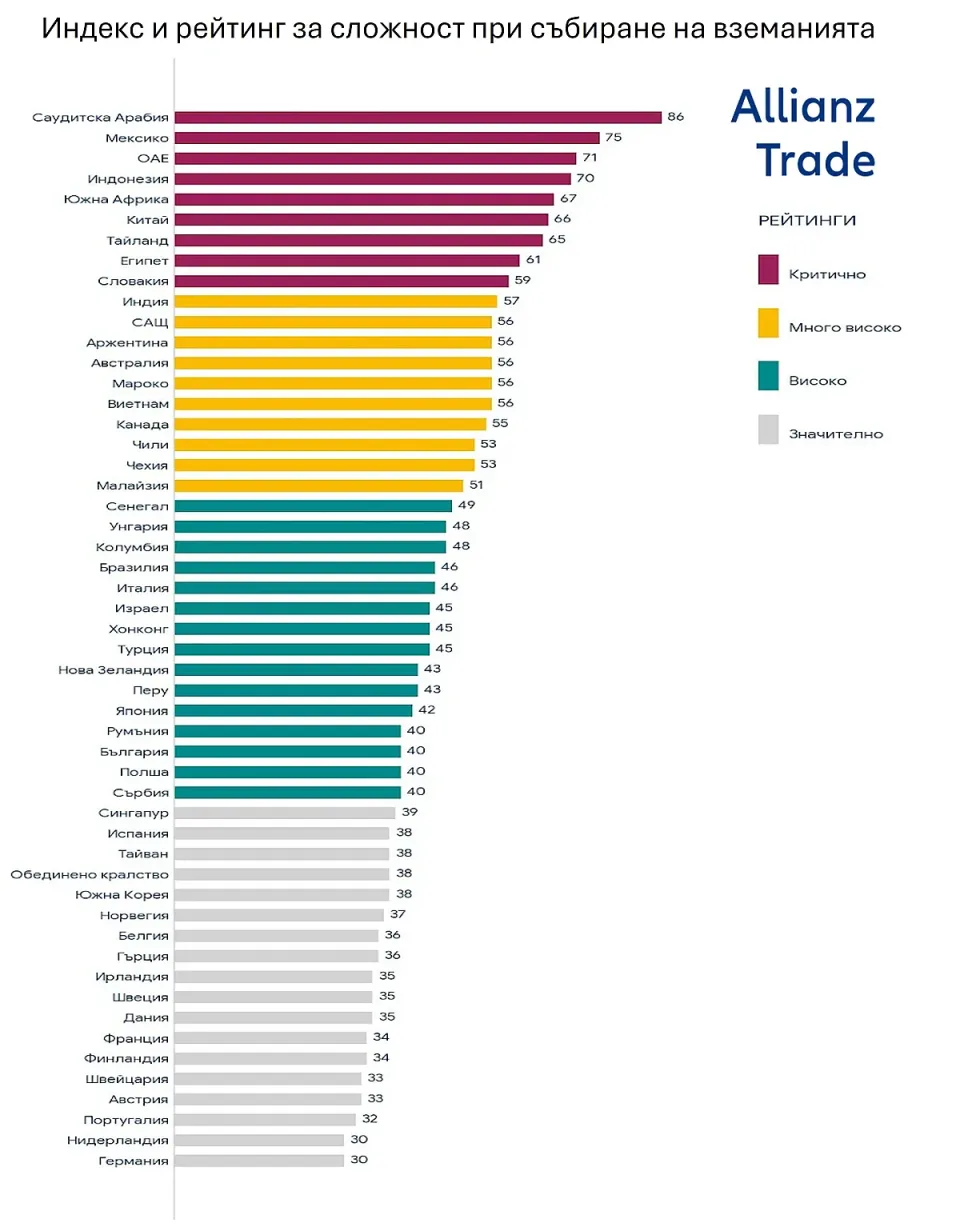 Според индекса събирането на вземания в България попада в категория „висока сложност“. Страната получава оценка 40 по скала от 0 до 100, където 100 означава най-трудна събираемост. Така България се нарежда в една група с още 14 държави. За сравнение, осем икономики са в „критичната“ зона, 11 – в категорията „много висока“ сложност, а 18 държави са в най-благоприятната група с относително нисък риск.