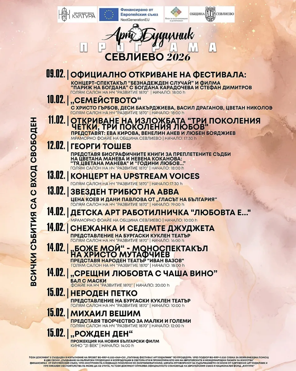 С концерт-спектакъл на Богдана Карадочева и Стефан Димитров пък стартира в понеделник, 9 февруари, програмата в Севлиево. Домакин както на това, така и на повечето от останалите събития в афиша там е Народно читалище „Развитие 1870“ в града, като всички са с „вход свободен“.