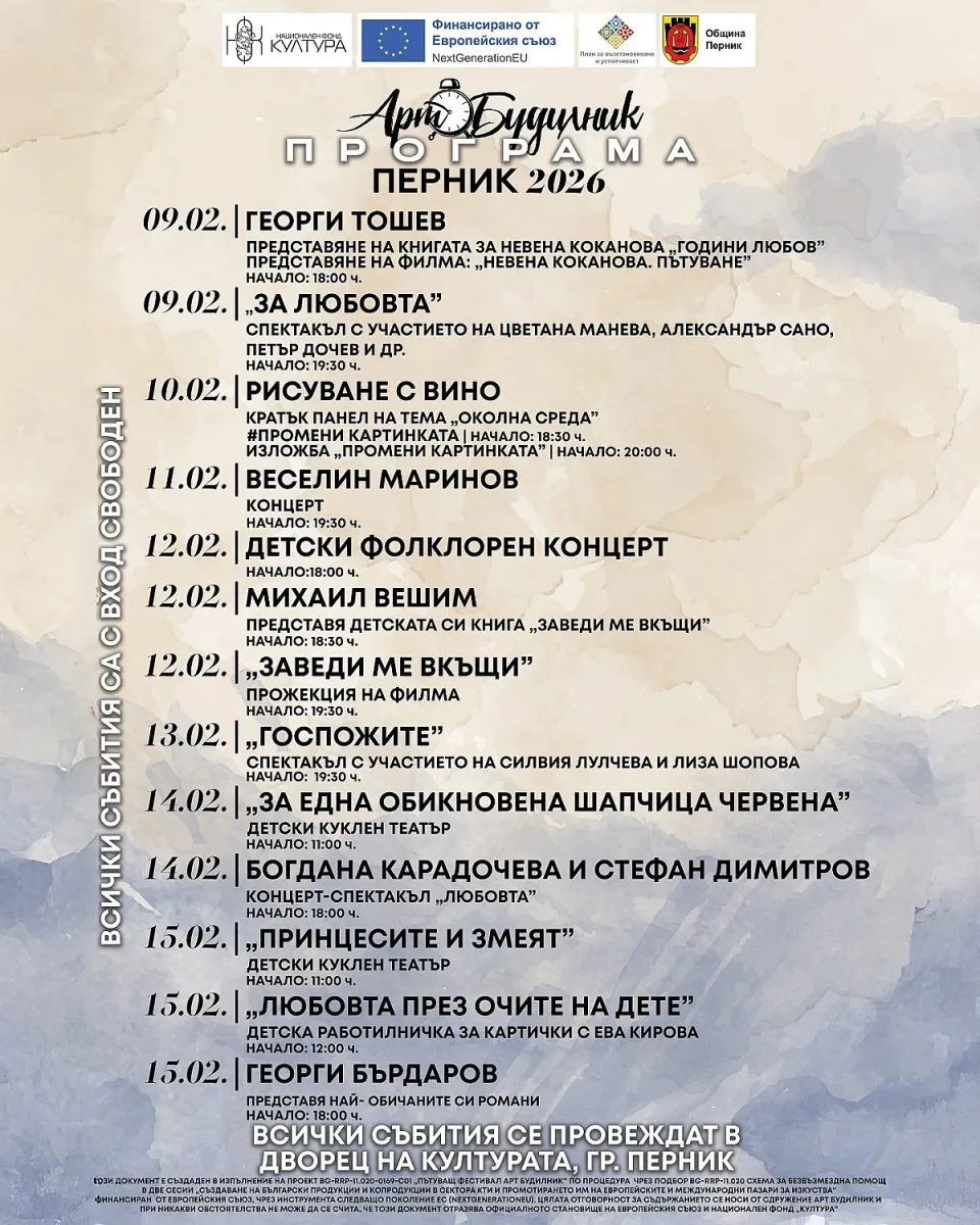Седмицата на любовта ще е пълна със звезди в два от градовете на страната. За седемте дни от 9 до 15 февруари, Перник и Севлиево се превръщат в притегателни центрове за българската култура благодарение на фестивала „Арт Будилник“. За първа година той прави едновременно две свои издания в две различни общини, в рамките на които жителите и гостите им ще могат да се насладят на 14 събития за малки и големи, изцяло с „вход свободен“. Те се провеждат под егидата и с подкрепата съответно на Община Перник и Община Севлиево.