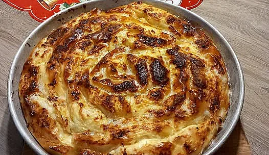 Печете в предварително загрята фурна на 180 °C около 30–40 минути или докато баницата стане златиста. Оставете леко да изстине преди сервиране.