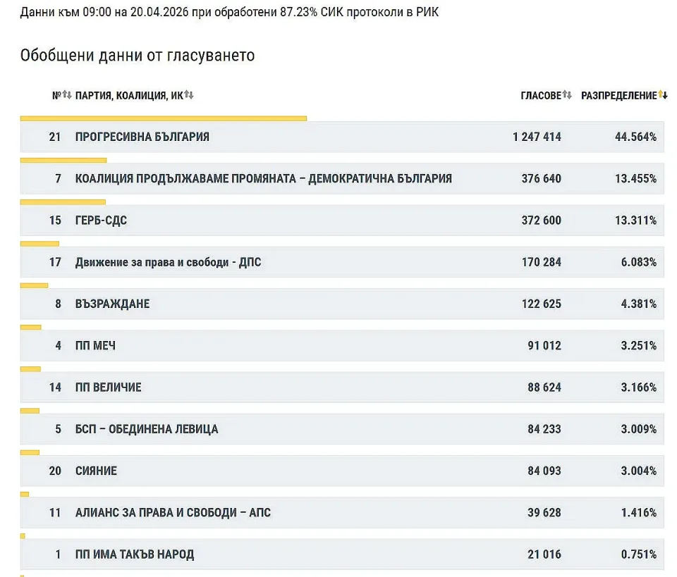 Централната избирателна комисия публикува нови междинни резултати от парламентарните избори при 87,23 процента обработени протоколи на секционните избирателни комисии. Данните затвърждават категоричната преднина на Прогресивна България на Румен Радев. Очертава се ясна конфигурация на силите в следващия парламент. Финалното разпределение ще бъде потвърдено след приключване на преброяването.