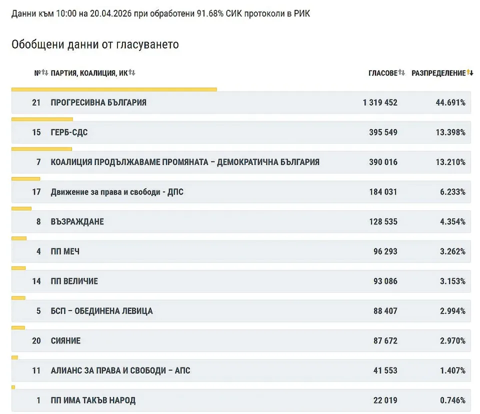Централната избирателна комисия публикува нови междинни резултати от парламентарните избори при 91,68 процента обработени протоколи на секционните избирателни комисии. Данните затвърждават категоричната преднина на Прогресивна България на Румен Радев и показват разместване в борбата за второто място. Очертава се почти окончателна конфигурация на следващия парламент. Финалните резултати се очакват след пълното преброяване.