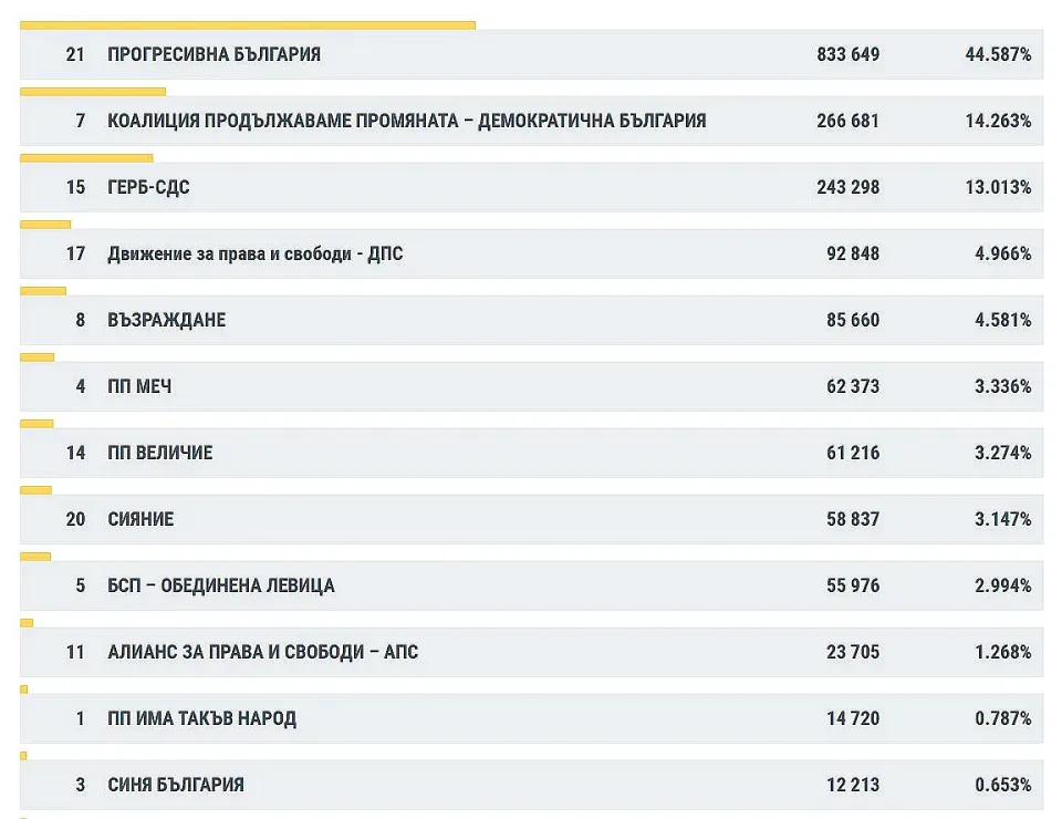 Централната избирателна комисия публикува междинни резултати от парламентарните избори при 60,79 процента обработени протоколи на секционните избирателни комисии. Данните са към 6:00 часа и очертават ясна преднина за Прогресивна България. Резултатите показват и оспорвана битка за следващите позиции. Окончателното разпределение ще стане ясно след пълната обработка на протоколите.