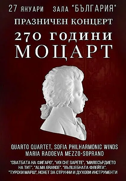 По повод 270-годишнината от рождението на Волфганг Амадеус Моцарт, в зала „България“ ни очаква изискан музикален празник, в името на великия гении в историята на музиката. Концертът предлага различна програма с произведения на Моцарт, в които се срещат кристалната яснота и драматична дълбочина на гласа на оперна прима Мария Радоева – мецосопран и неподражаемата хармония, мелодичност и музикално майсторство на изключителните музиканти от Кварто, заедно с Филхармоничния духов квинтет.