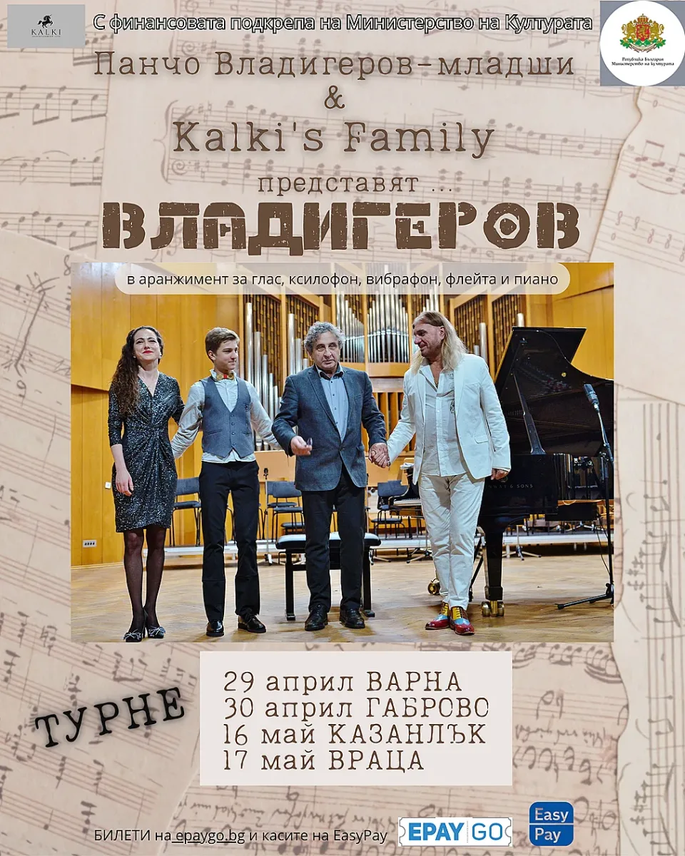 Нов концертен проект обединява традиция, талант и съвременно звучене в уникален музикален формат, посветен на творчеството на Панчо Владигеров. Под заглавие „Панчо Владигеров – младши и Kalki’s Family представят ВЛАДИГЕРОВ“, събитието предлага оригинални аранжименти на емблематични произведения, изпълнени от нестандартен камерен състав ще прозвучат в четири града из страната: 29 април – Варна, 30 април – Габрово, 16 май – Казанлък, 17 май – Враца.