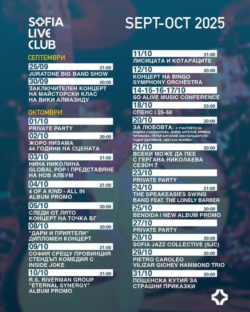 Така SOFIA LIVE CLUB дава заявка за един сезон, изпълнен с различни музикални светове, от поп и джаз, през фънк и рок, до стендъп и жанрови експерименти. Всичко това на една сцена, в сърцето на София.