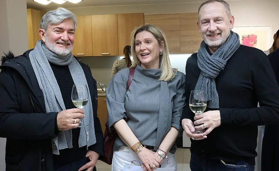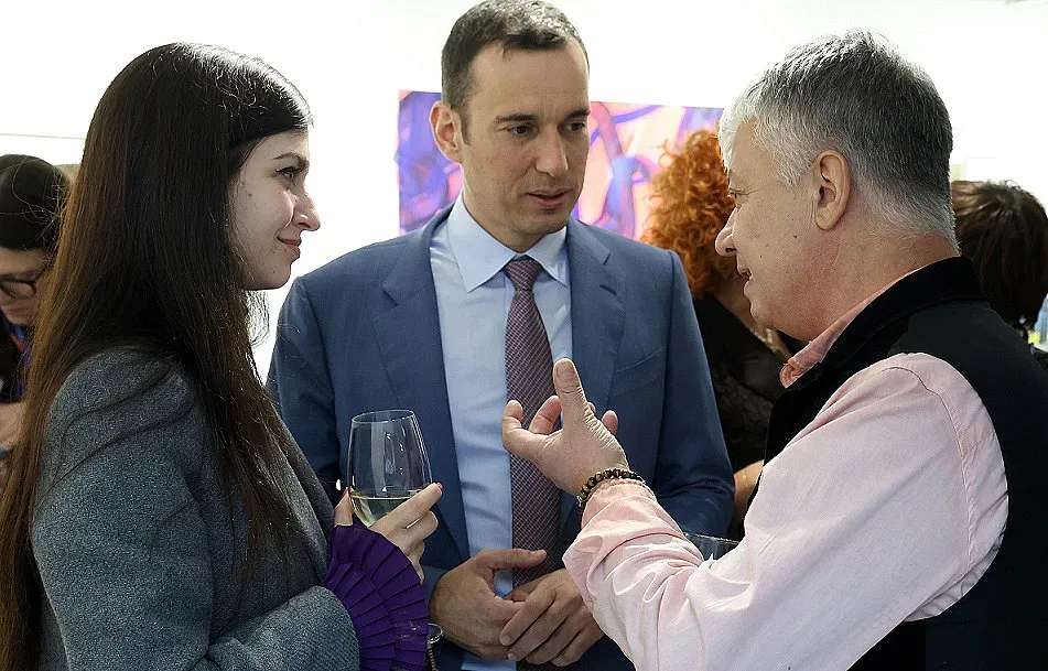 Бизнес дамата Милена де Берг с аташето по културното сътрудничество във френското посолство Едуар Морно и скулптора Аксел Морел
