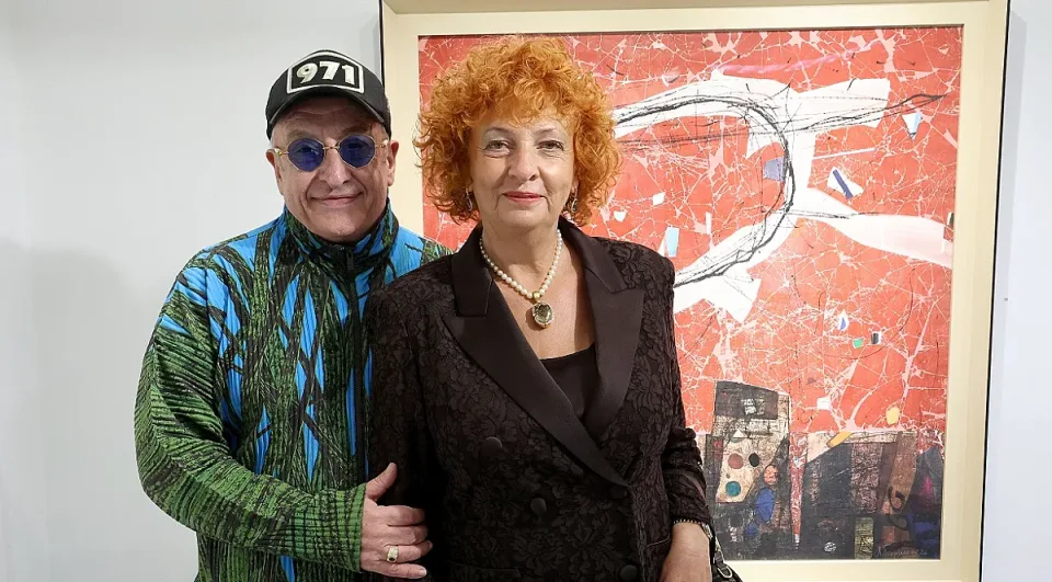 Международният куратор Стефан Стоянов и меценатът Мариела Гачевска пред една от графиките на Людмил Георгиев