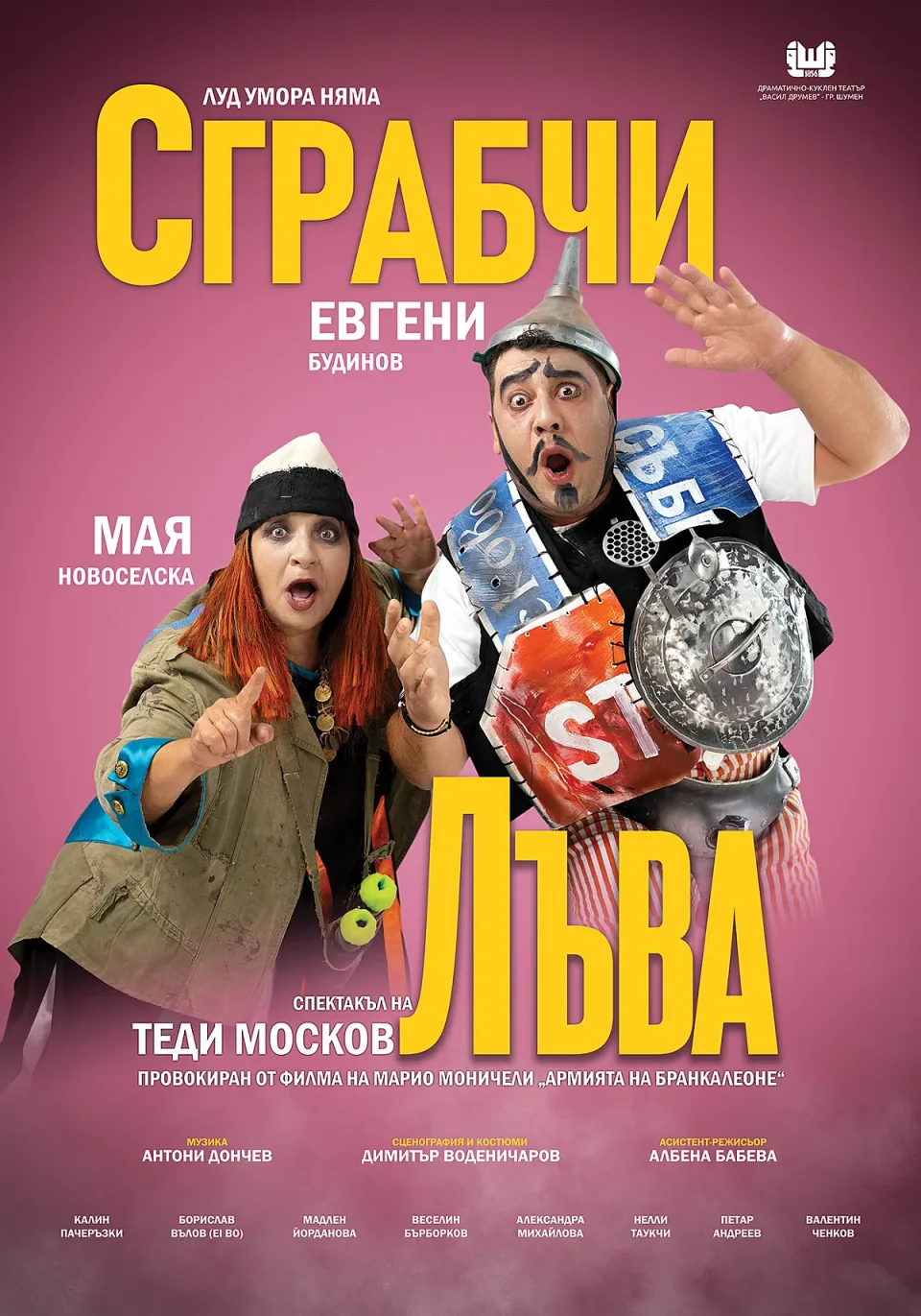 В спектакъла участват Мая Новоселска и Евгени Будинов като гост-актьори, заедно с актьорите от шуменския театър Калин Пачеръзки, Веселин Бърборков, Мадлен Йорданова, Нелли Таукчи, Петар Андреев, Борислав Вълов – Ей Бо, Александра Михайлова и Валентин Ченков.