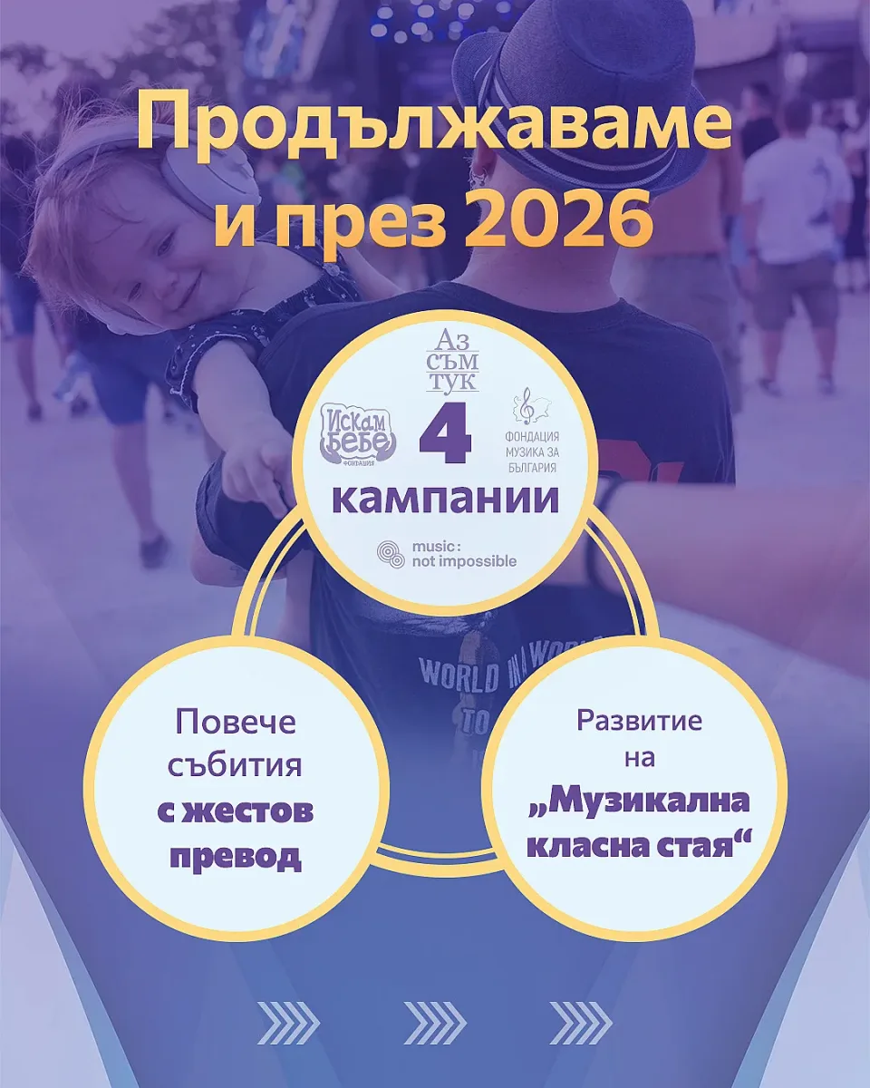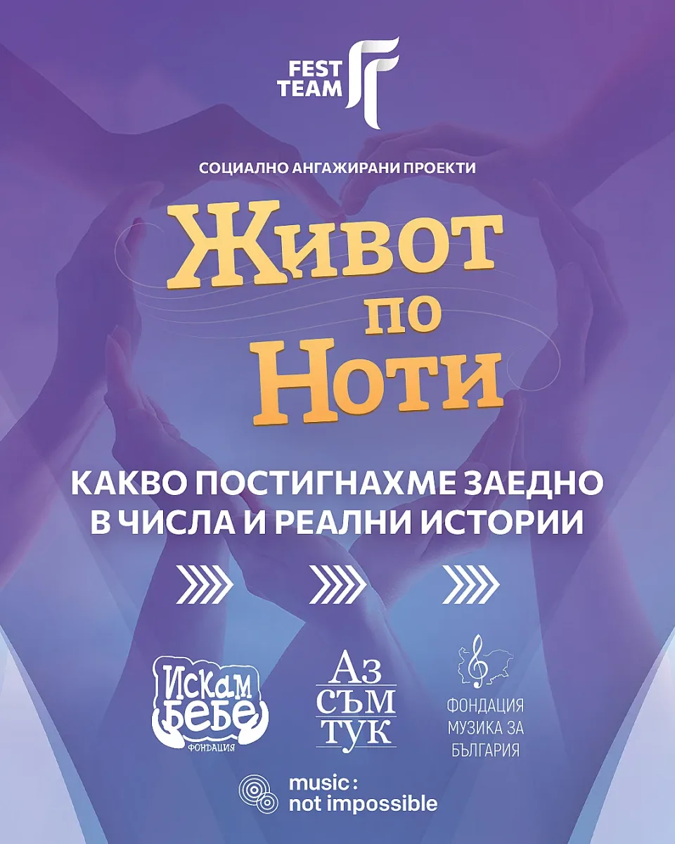 Музиката има силата да прави повече от това да вълнува, тя може да вдъхновява действия, да създава промяна, да носи реална подкрепа. И през новата концертна година Fest Team продължава и доразвива своята социална ангажираност не чрез символични жестове, а чрез устойчиви инициативи с измерими резултати. През 2026 програмата включва четири кампании, всяка от които фокусира върху различен кръг от хора - тези, които чакат или се надяват за нов живот, децата, за които музиката да стане по-достъпна, възрастните, които заслужават да се чувстват видими и приети и хората с увреден слух, за които концертното преживяване доскоро беше невъзможно.