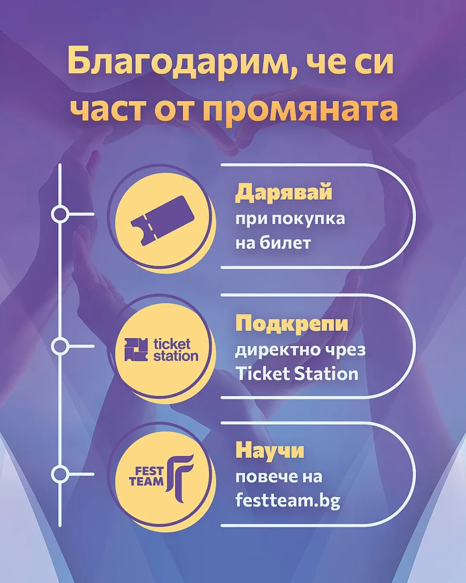 Fest Team продължава да полага системни и устойчиви усилия за по-добро бъдеще чрез инициативите, които подкрепя. Дарителите могат да подкрепят каузите не само по време на покупка на билет за събитията на Fest Team, но и директно чрез мрежата на Ticket Station. Повече подробности, финансова отчетност и истории на реални хора - на сайта на Fest Team.