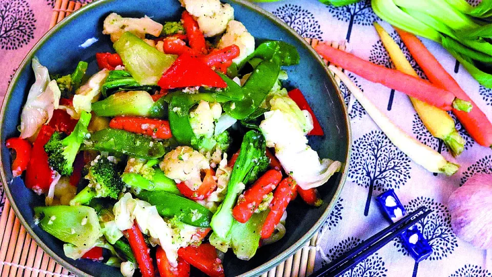 Приготвяне: Нарежете всички зеленчуци на хапки. Загрейте гхии в тиган на среден огън. Добавете чесъна (само за няколко секунди). Сложете зеленчуците и ги сотирай 7–10 минути до леко омекване. Подправете със сол, пипер и лимон.