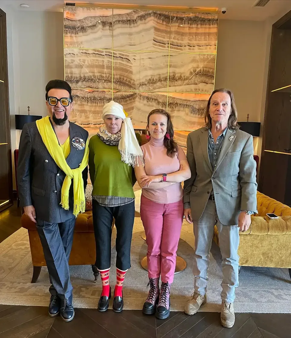 Лорд Минчев и княгиня Калина са обядвали в хотел София Балкан Палас, където на 14 ноември ще се проведе Бизнесдама на годината, а с тях са били още бизнесдамата Тася Тасова и Китин Муньос - съпруг на Калина (на снимката). Аристократичната двойка са кумове на Тасова и неразделни приятели. Вещите в модата веднага са разкрили, че княгинята е била облечена в цветовете на българското знаме, както следва - бял тюрбан, зелена блуза и червени чорапи с българска шевица.