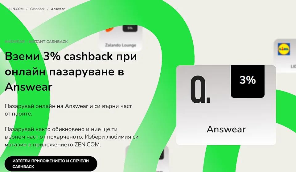 Онлайн пазаруването е неотделима част от модерния начин на живот. С Незабавния кешбек от ZEN.COM то се превръща и в умен начин за спестяване. Независимо дали избирате модния асортимент на Answear, премиум предложенията на Modivo или много други партньори, всяка покупка с картата ZEN ви връща реални пари за секунди.