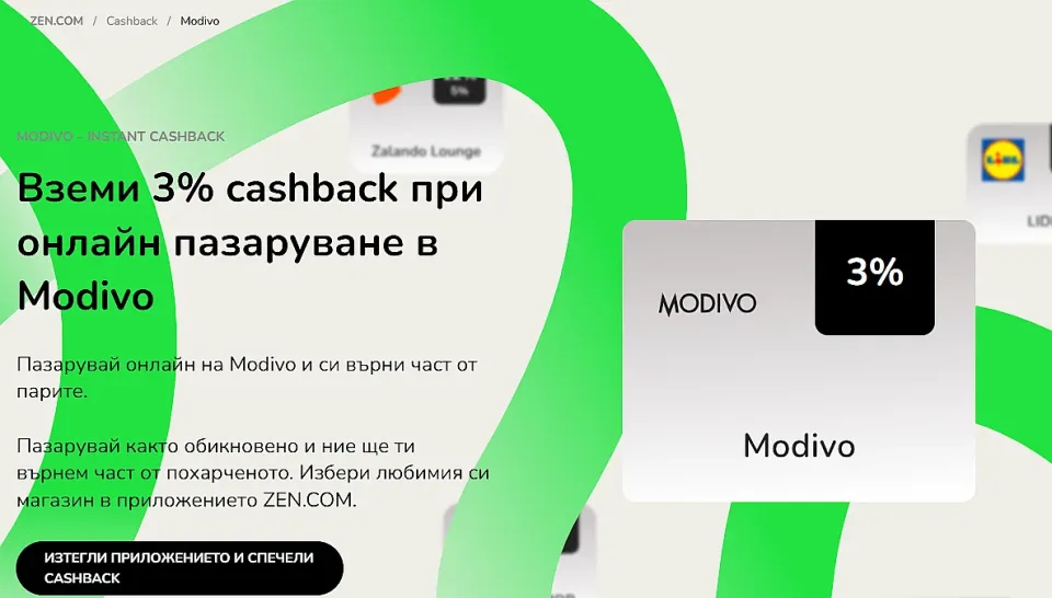 Онлайн пазаруването на дрехи вече не е само удобство, то може да бъде и активен начин за спестяване. Всеки път, когато отворите Modivo през приложението ZEN.COM и платите с картата ZEN, вие буквално печелите от шопинг. Незабавният кешбек от ZEN.COM превръща всяка покупка в малка инвестиция обратно в джоба ви.