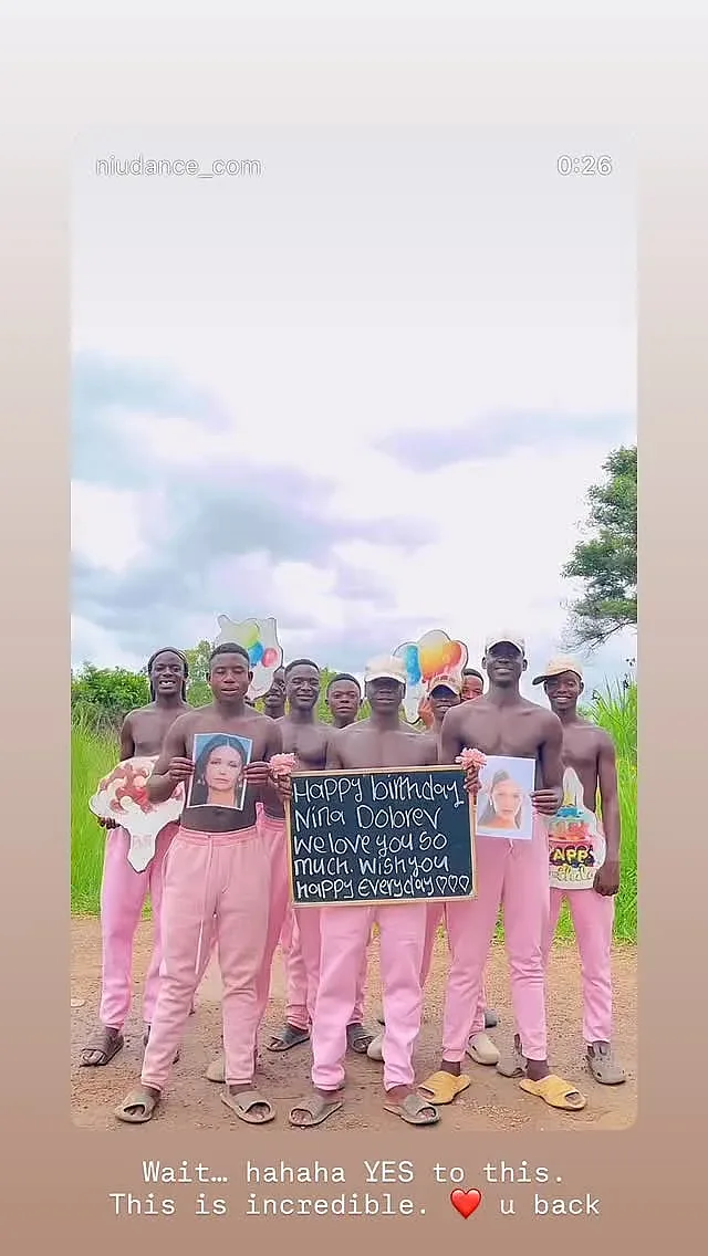 Забавен е клипът с дузина тъмнокожи млади мъже в розови анцузи, които й честитят рождения ден и целуват нейни снимки.