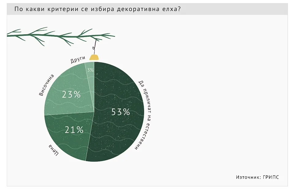 Най-важният критерий за избор в 12-те държави е визията на елхата. Семейства, общини, търговски центрове и ритейл паркове искат елхата да е максимално близка до естествената. На второ място по важност е височината, а на трето – цената. Най-често поръчваната елха е между 1.80 и 2.20 метра. Семействата сменят елхата си на 5-6 години.