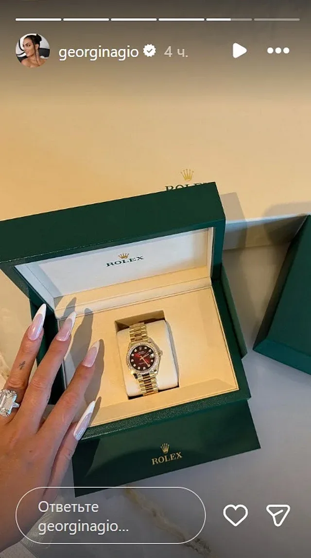 Джорджина показа подаръка от любимия си също в социалните мрежи – един от хитовите в момента часовници от премиум швейцарската марка Rolex.
