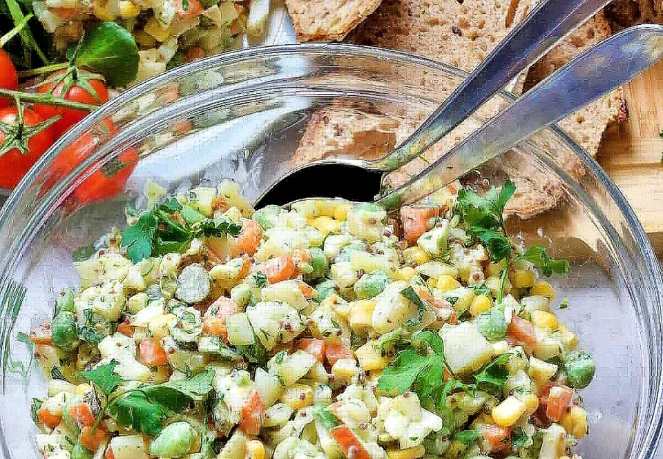 Продукти (за 4–6 порции): 4-5 сварени картофа, нарязани на кубчета, 2 моркова, сварени и нарязани на кубчета, 150 г замразен грах, сварен или задушен, 3-4 кисели краставички, нарязани на малки кубчета, 100 г варено тофу или темпе, нарязано на кубчета (замества яйца/месо), 150-200 г веган майонеза (на основата на соя или слънчогледово масло), сол и черен пипер на вкус, пресен магданоз за украса