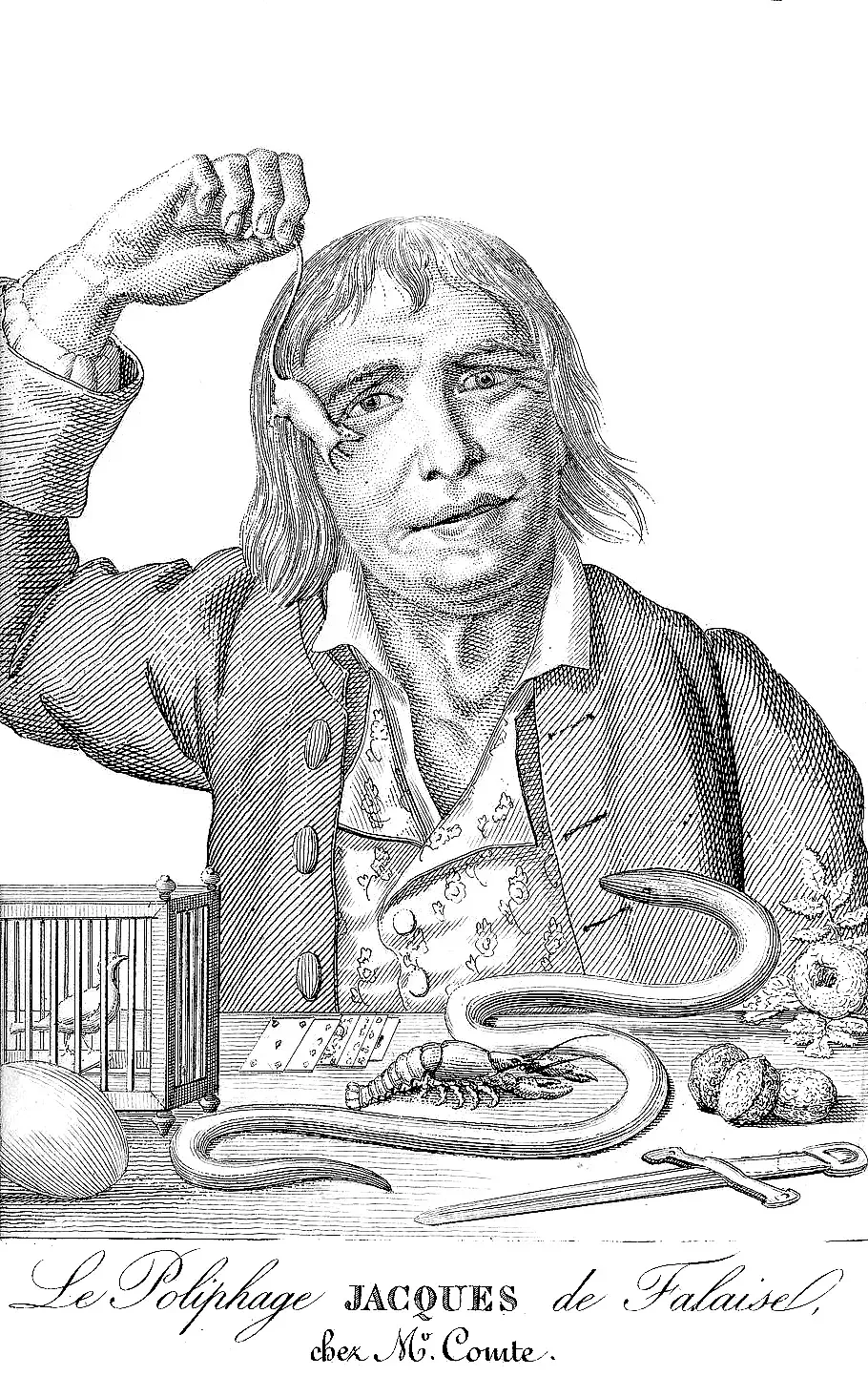 Медиците, които тогава все още жонглират между хуморната теория и нови анатомични прозрения, виждат пред себе си жив експеримент. Предлагат му месо, хляб, свинска мас, дават му даже чужди и опасни обекти, като камъни, въглени, дребни животни. Една котка изчезва в гърлото му, а после се връща наполовина смляна. Гущер и змия не будят отвращение. Той ги поглъща с инстинкт, който изглежда по-силен от всяко човешко колебание. В болничната зала мирише тежко.