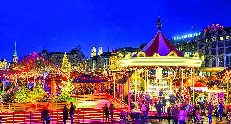 Най-големият швейцарски град също няма да пропусне да засияе под светлините на атрактивния си празничен базар. Коледното селище в Цюрих е най-мащабният закрит базар в Европа, който впечатлява със 150 къщички. Освен греяното си вино и лакомства, Цюрих представя и съкровището си - коледното дърво. Над 20 години то създава магията на централната жп гара с 15 метра височина и над 5000 кристала на Сваровски.