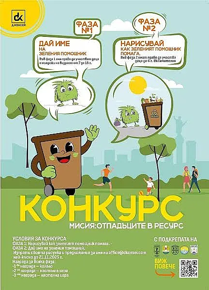 Д Консей заедно с общините обявява конкурс за име „зеления помощник“, който ще стане символ на комуникационната компания, свързана с разделното събиране на биоразградими отпадъци. В конкурса могат да участват деца от 7 до 18 години. За по малките също е помислено – те могат да участват с рисунка, в която да изобразят „Как е правилно да изхвърляме отпадъците си?“. Срокът на конкурса е до 21 ноември 2025 г. Победителите в двете категории ще получат велосипед, като са предвидени и няколко допълнителни награди – настолни игри. Повече подробности за конкурса, могат да бъдат получени от интернет страницата на Д Консей: dkonsei.com в секция „Новини“.