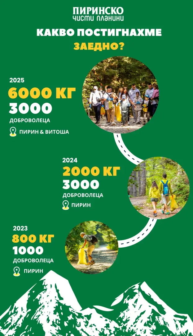 Кампанията вече е сред най-популярните в страната. За последните три години над 7000 доброволци са се присъединили към каузата, а близо 10 тона отпадъци са събрани от българските планини.