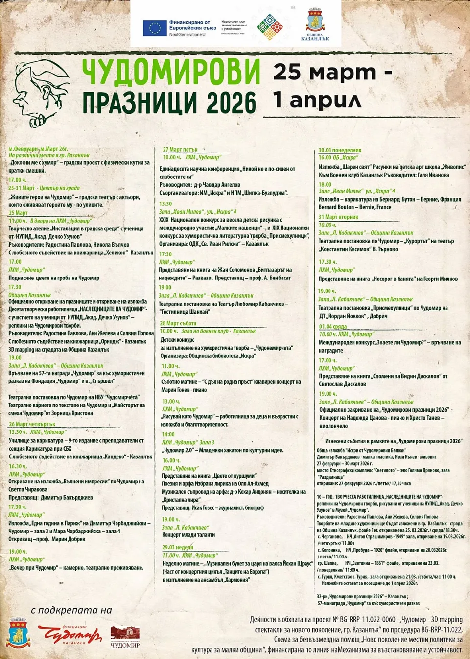 Още преди официалния старт, жителите и гостите на Казанлък ще могат да се включат в нестандартния градски проект „Докосни ме с хумор“, който ще разпръсне из града кутии със смешки, както и в инициативата „Живите герои на Чудомир“, където емблематични персонажи ще оживеят по улиците.