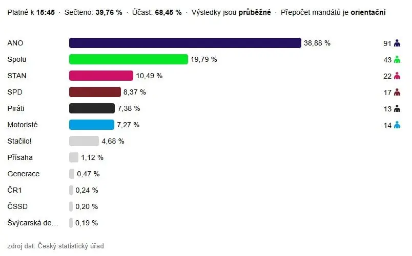 Дясната популистка партия АНО на милиардера - бившият премиер Андрей Бабиш, който се самоопределя като "тръмпист" и се противопоставя на продължаващата военна помощ за Украйна, ще спечели 35,5% от гласовете. Дясноцентристката коалиция "Заедно", оглавявана от премиера Петр Фиала, е на път да вземе 22,4% от гласовете, коментира Дойче веле.