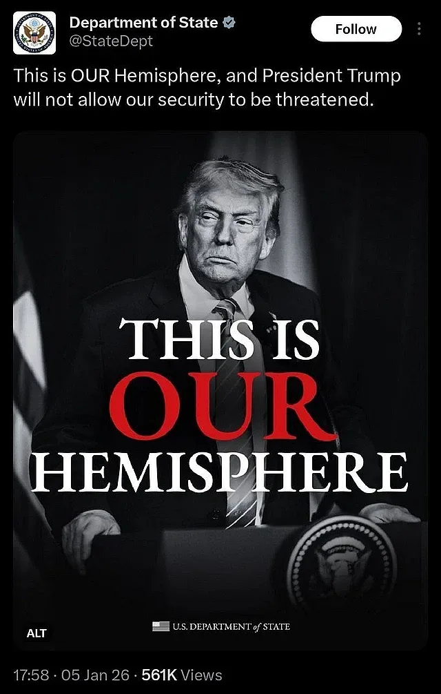 Държавният департамент на САЩ официално обяви Западното полукълбо за изключителна зона на интерес на страната си.