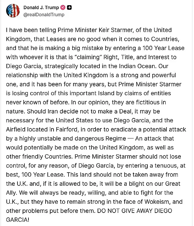 Тръмп не пропусна да повтори, че "Киър Стармър прави голяма грешка, като сключва 100-годишен договор за наем с когото и да е, който "претендира" за права, собственост и интереси върху Диего Гарсия".
