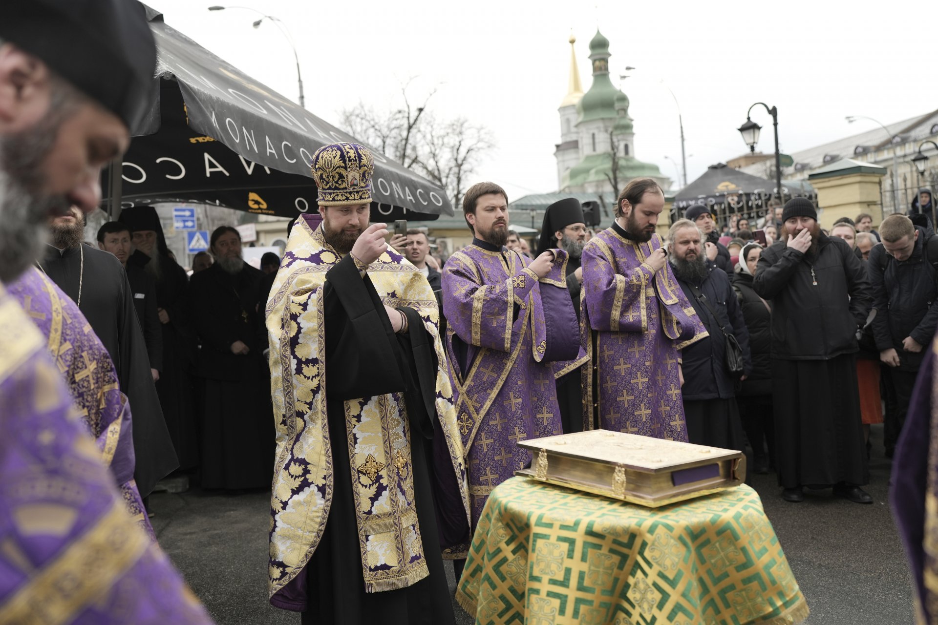 Свещеници от Украинската православна църква се помолиха със своите поддръжници, след като се противопоставиха на правителствена заповед да напуснат манастирския комплекс.