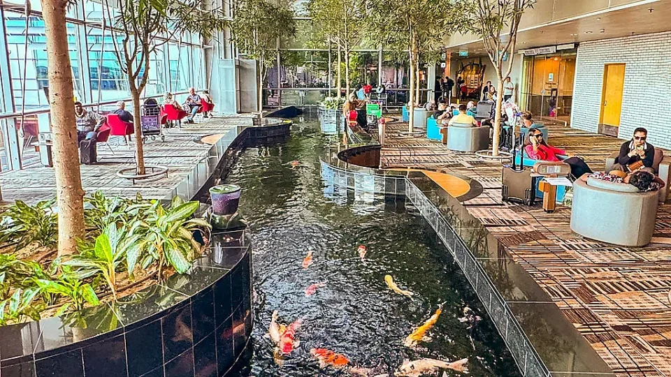 Дни по-късно, след безпроблемен чек-ин за полета обратно, чакате в транзитната зона – с безплатно 24-часово кино, градина с пеперуди и най-високия закрит водопад в света. Има дори стъклен водоем, по който можете да вървите, с дигитален покрив, отразяващ времето навън. Понякога забравяте, че сте на летище, а не в малък, футуристичен град, управляван с впечатляваща лекота.