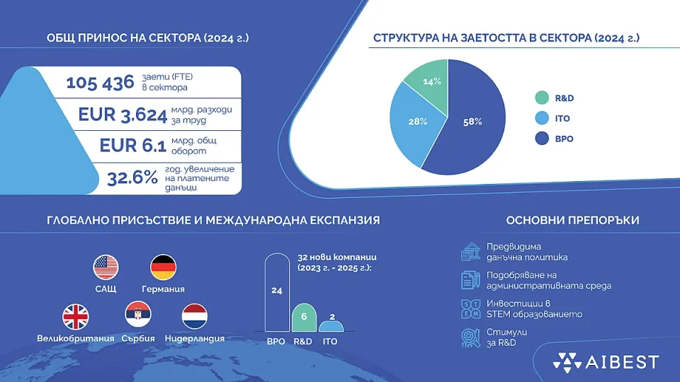 По данни на AIBEST индустрията на знанието обединява 833 компании в сегментите BPO, ITO и R&D, като секторът на информационните и комуникационни технологии формира 9,6% от брутната добавена стойност на страната – едно от най-високите нива в Европейския съюз. България запазва позициите си като водеща регионална дестинация за дигитални и бизнес услуги и присъства в глобалния топ 10 по регулаторно качество.