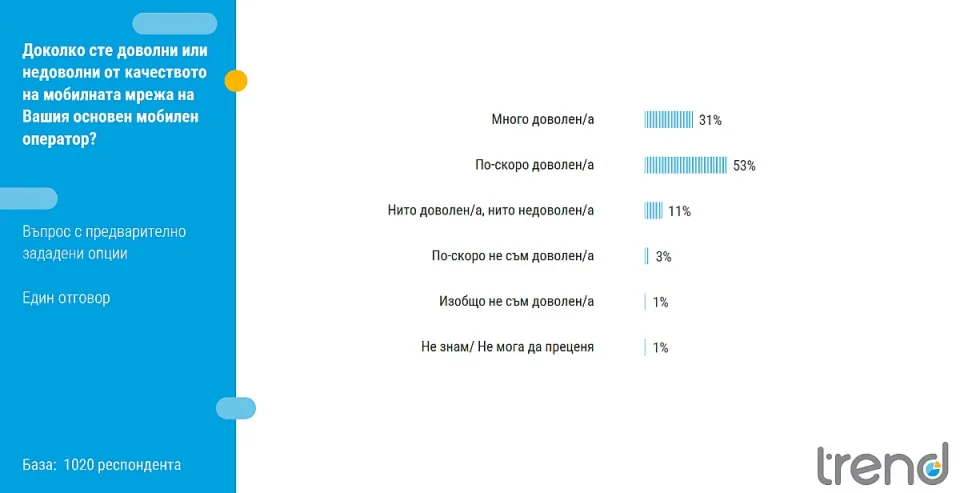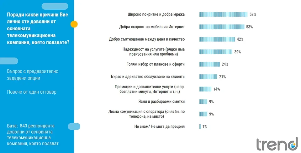 84% от потребителите са доволни от мобилните услуги, а почти същият процент оценява положително домашния интернет и платената телевизия. Основните причини за високата оценка са широкото покритие (57%) и добрата скорост на мрежата (53%), следвани от доброто съотношение между цена и качество (42%) и надеждността на услугите (39%).