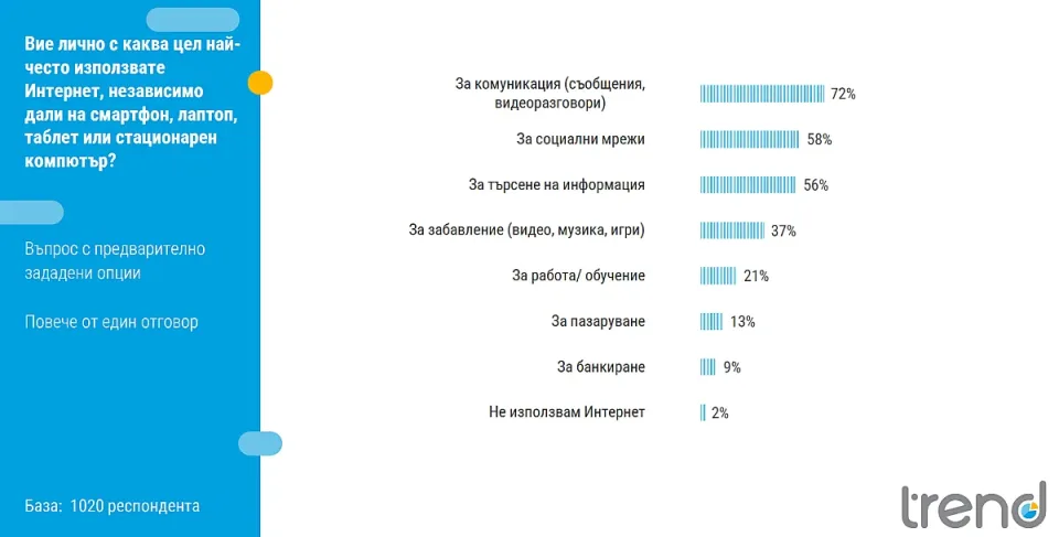 Интернетът у нас се използва основно за комуникация (72%), социални мрежи (58%) и търсене на информация (56%). Жените и младите до 50 години са по-активни в социалните мрежи, докато мъжете между 40 и 60 търсят повече информация. Две трети от младите използват интернет предимно за забавление, а едва една пета – за работа или учене.