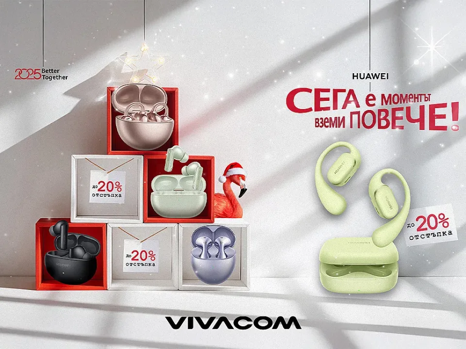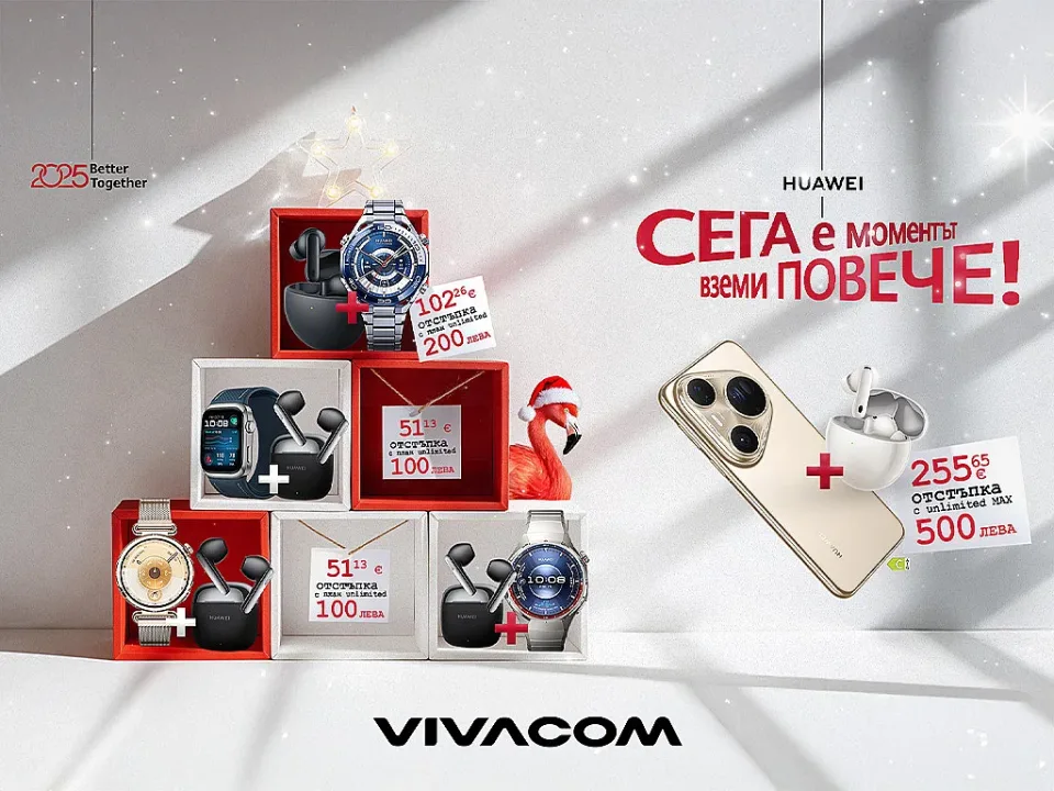 В месеца с един от най-светлите празници от годината Vivacom предлага възможност за най-хубавите поводи да зарадваме любимите си хора с подаръка, който наистина искат. През целия декември Vivacom предлага атрактивна селекция от устройства на бранда Huawei. В рамките на кампанията клиентите могат да се възползват от промоционални комбинации с отстъпки до 255.65 € | 500 лв., аудио аксесоари на по-ниска цена и избрани устройства на лизинг без оскъпяване в сравнение с цената при еднократно плащане с 24-месечен договор за план Unlimited. Моделите могат да бъдат комбинирани с планове от серията Unlimited. Vivacom предлага серия от празнични предложения за своите клиенти, за да допринесе за една истински вълшебна Коледа с Vivacom.