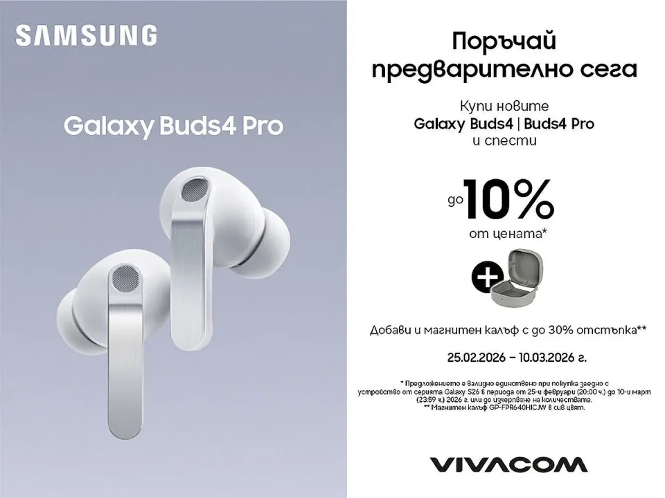 Vivacom приема предварителни поръчки за хитовата серия на Samsung Galaxy S26, още в деня на световната премиера. Предварителните заявки за устройствата стартират на 25 февруари 2026 г. от 20:00 ч. и продължават до 23:59 ч. на 10 март 2026 г., като потребителите могат да спестят до 200 € | 391.17 лв. и да получат два пъти повече памет за съхранение. В същия период Vivacom стартира продажбата и на новите безжични слушалки Galaxy Buds4 и Buds4 Pro с до 10% отстъпка от цената и до 30% отстъпка за магнитен калъф, закупени в комплект със Samsung Galaxy S26.