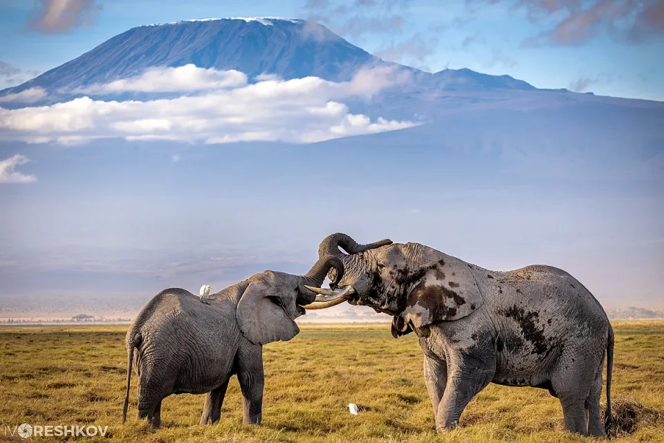 В случая търсихме да снимаме слонове на фона на връх Килиманджаро. И попаднахме на тези два мъжкаря – голям и малък, които си играеха с хоботите. Направо ни изнесоха цял спектакъл на фона на заснеженият Килиманджаро. Беше направо магическо!“, пояснява Орешков.