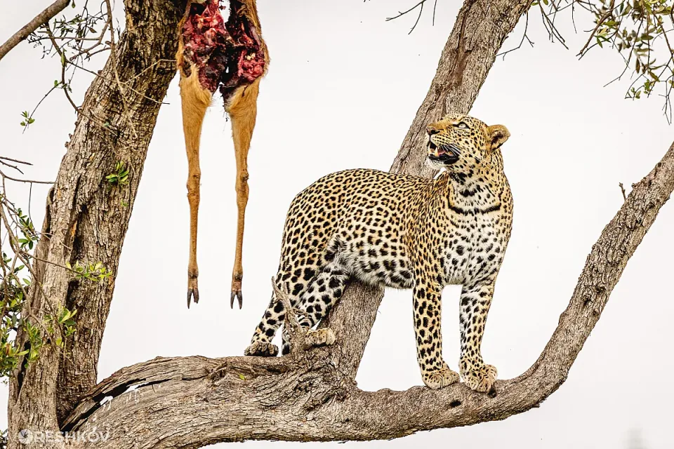 И така: стигнахме до леопарда. Огромната котка обаче спеше в короната на дървото и изобщо не се виждаше за снимка. Под него на клоните беше преметната убита антилопа. По всичко личеше, че котката тъкмо е похапнала и се е отдала на дрямка. Кофти за нас. Но ние бяхме упорити и готови на всичко за якият кадър. Стояхме до дървото цели 4 часа в очакване красавицата да огладнее и да стане да похапне. Всъщност дори и да искахме нямаше как да си тръгнем, защото около дървото се събраха към 50 джипа и бяхме в зверско „задръстване“. Но накрая чакането ни се възмезди. Леопардът стана, разходи се величествено по клоните на дървото, застана да ни позира за няколко снимки, след което скочи върху мъртвата антилопа и започна да похапва. По време на този няколко минутен спектакъл, направихме кадрите си.