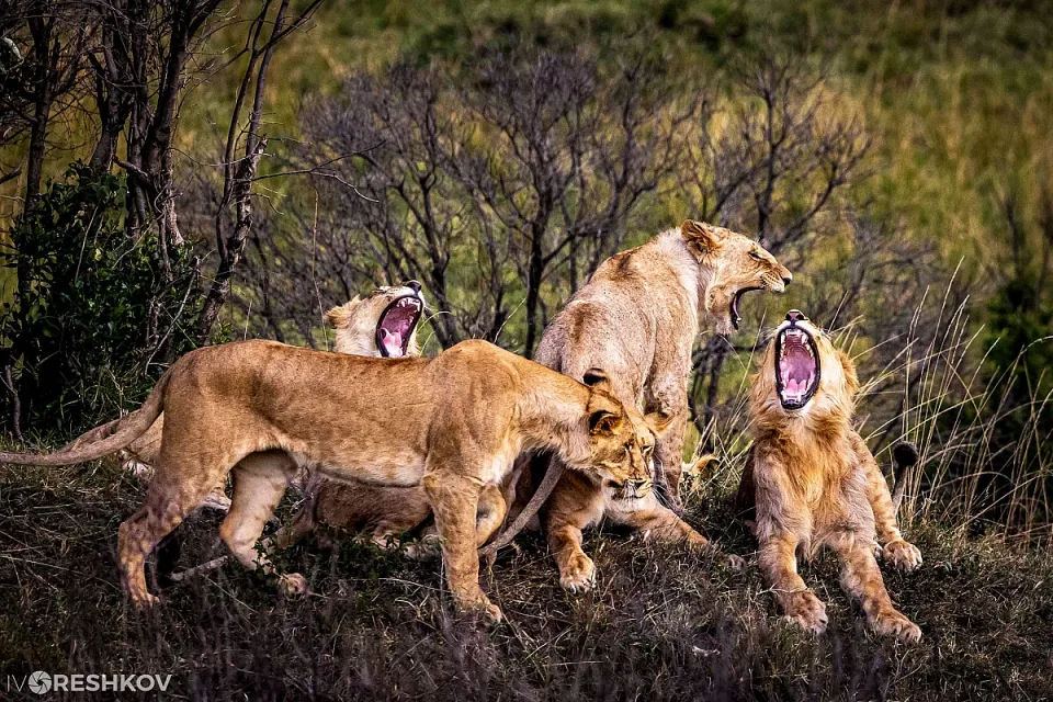 Така попаднахме на цял спящ прайд, състоящ се основно от майки с по-големи лъвчета. Стояхме там, гледахме спящите котки и се чудехме има ли смисъл да си губим времето с тях или да ходим да търсим нещо по-интересно за снимки. Хубавото беше, че това се случи малко преди залез слънце. Изведнъж безжизнените лъвове се размърдаха и започнаха един по един да стават от „леглата си“ и да се скупчват. Започнаха огромни прозявки, гушкане едни в други. Това продължи само няколко минути, след което тръгнаха към залеза, навярно за предстоящ лов. Но това беше моментът, в който направих няколко яки кадъра, в единият от които съм уловил едновременна прозявка на три лъва“, описва необикновения свят там Иво. И допълва, че другата „интересна котка“, най-бързото животно – гепардът, за разлика от леопардите и лъвовете, ловува денем. Като разчита на момента на изненадата и бързата скорост, която развива, за да улови плячката си.