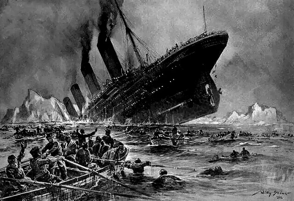 Пътниците от трета класа разбиват решетките и се юрват към горната палуба. Там оркестърът свири валс и цари паника: майки с деца на ръце пищят, влюбени се прегръщат за последно – на кораба имало 13 двойки, тръгнали на меден месец.